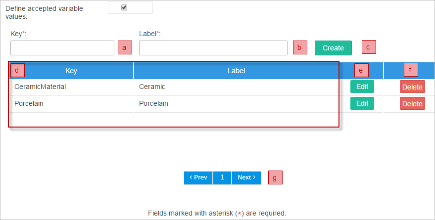• d. List of the options already added to the variable. In this list the key (value) of the option and its label are shown.