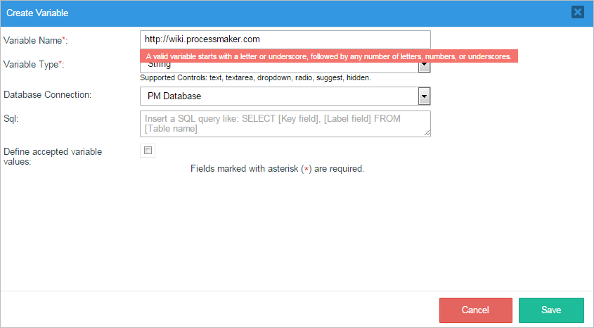 1. Variable Name: Required. Variables have a unique name without spaces between 3 and 64 characters long, which ProcessMaker uses to identify the variable. ProcessMaker designers can use the variable name in DynaForm fields, email and Output Documents templates, trigger code, etc. Normal PHP variable naming rules apply, so the name is case sensitive and it must start with a letter or underscore and can only contain characters which are letters, numbers and underscores. Symbols and spaces are not allowed.