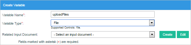 • File: Variable to store the file(s) selected in a file control. An Input Document can also be associated with a file variable. When defining an Input Document, a file variable can be selected to hold its contents, so that the Input Document can be accessed through a file control in a DynaForm or as a variable in a Trigger. Define the maximum file size, the destination path and allowed file extensions of the uploaded files in the Input Document. The file variable can then be associated with an existing Input Document.