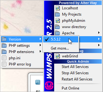 Finally, to confirm the configuration changes save the file and make left-click on the WampServer icon, choose "PHP", then "Version" and click on the "php5.x.x" menu item.