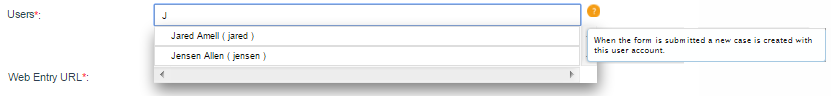 The next required field is "Users". Choose the person who will initially be assigned to the new case. The orange icon with a question mark indicates the description of the field. This field works like a search box; try adding a letter and a user that starts with that letter will appear in the suggest box.