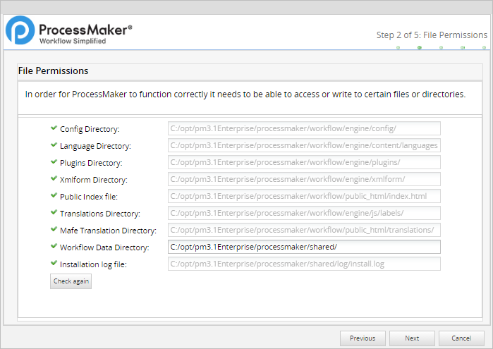 If there was a problem writing the ProcessMaker files, change the file permissions of the directories to give Apache access.