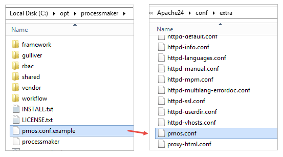 C:\opt\processmaker\pmos.conf.exampletoC:\Apache24\conf\extra\and rename it from pmos.conf.example to pmos.conf.