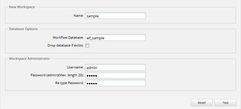 Workspace Administrator: Defines the credentials of the administrator user for the workspace that will be created. This user will have the PROCESSMAKER_ADMIN role by default.