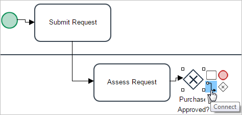 As mentioned before, if the request was rejected, it will go back to the task "Order Request". To do this in the design, click on the gateway and select the Connect shape (that represents the flow) from the Quick Toolbar.