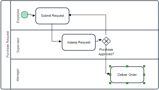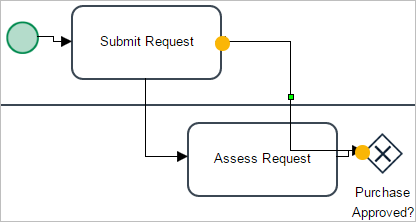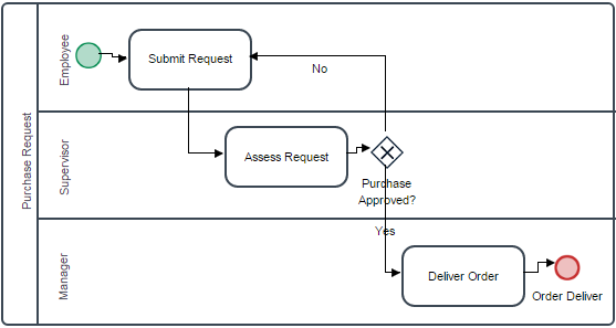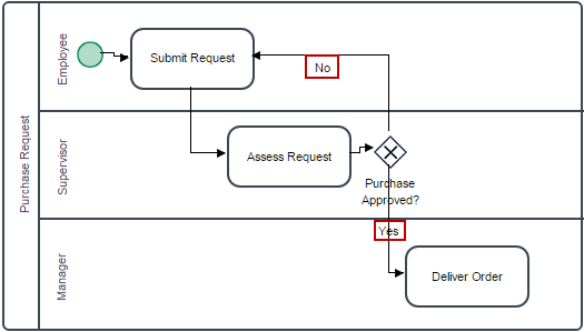 To have a better understanding of what the paths do in the gateway evaluation, label the flow lines from the gateway as “Yes” (the line to “Deliver Order” for approved requests) and “No” (the line to “Submit Request” for rejected requests). To do this, double click on the arrow of the lines to edit the labels.