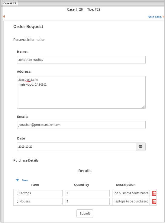 After filling out the "Order Request" form, click on its Submit button to save the information to the ProcessMaker server. The next step in the task is the assignment of a users in the Supervisor group to the next task.