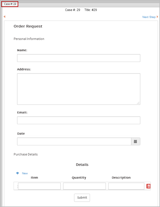 When the case is opened, the DynaForm created for the first task will be displayed. Each case is identified by a unique number, which is shown in the header.