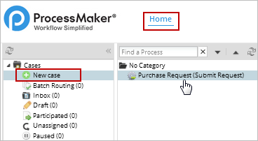 Then, go to Home > New Case and double click on “Purchase Request (Submit Request)” to initiate a new case.