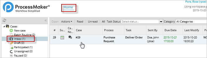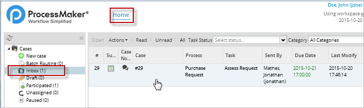 The case 29 sent by “Jonathan Mathes” will be listed in John Doe's inbox, which can be seen by going to Home > Inbox.