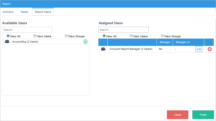 Once the data is defined successfully, in the next dialog select the groups and/or individual users that would be assigned as Report Users from the list at the left. The list of users and groups that the Report Designer can select from is limited by the users and groups defined in the Report Scope.