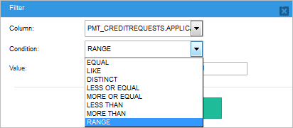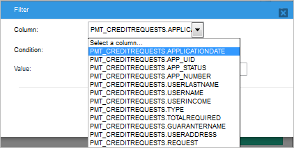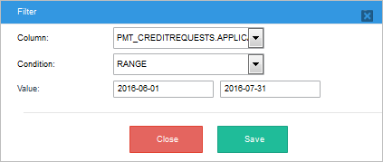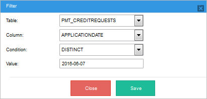 Filters: This section displays the criteria that is used to limit the number of rows of data that are retrieved. One or more filter conditions can be added. In this example, all the records of the report table "Credit Requests" will be selected with the exception of records with the date: "2016-06-07".