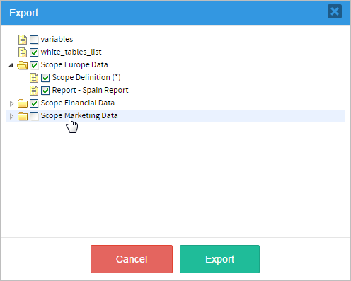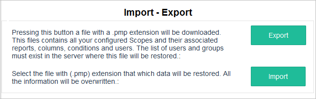 The exporting option stores the configured scopes, columns, conditions, groups of users and it generates a .pmp file. The user has the option to select which scopes, reports and configuration files will be include in the export (.pmp) file. When selecting a specific report, its scope will be automatically selected so inconsistencies between the source and target servers won’t be generated.