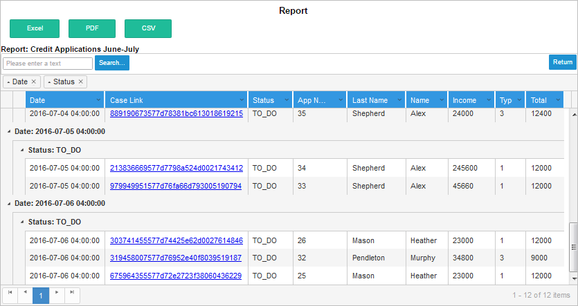 Select one report and click on the View Report button. The report view allows the user to easily apply grouping, sorting and filtering to the report records.