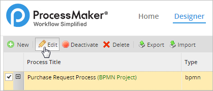 1. Select a process from the designer and double click on it. A process can also be opened by clicking on the Edit option in the top toolbar.