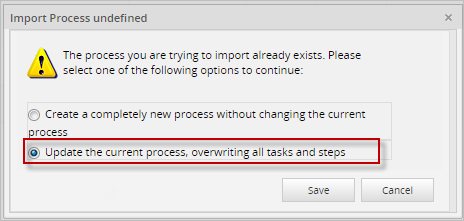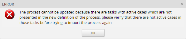 Some precautions need to be taken when overwriting processes that have active cases. If the existing process contains tasks with active (in-progress) cases, the process can NOT be updated with a process that doesn't contain these tasks and the following message will display:
