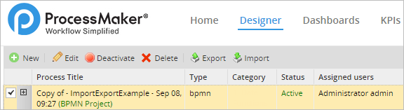 Projects and processes can be imported and exported from one installation of ProcessMaker to another. These procedures only import or export the definition of the process, which includes Dynaforms, Input, Output Documents, Triggers and group accounts. However, they do not import or export user accounts, roles, any case (if you need additional information on the transfer of ProcessMaker installations visit the ProcessMaker backup and restore), assignment rules, process supervisors, PM Tables and Report Tables (PM Tables and Report Tables possess their own interface to export them and then import them again).