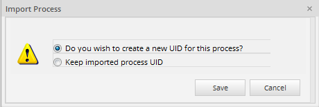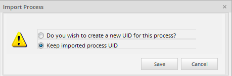 Note: Take into consideration that this new window that asks whether to create a new process UID or keep the process UID appears every time a process is imported. Since processes must have a unique name and UID, use this window to better maintain processes.