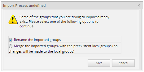 This option allows the user to rename the groups that are being imported. For example, if there is a group named "TestGroup" then by selecting the first option, as seen in the image above, a new group will be created with the name of "TestGroup1".