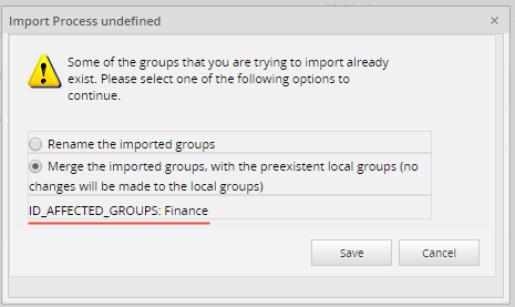 If the user chooses this option, it will merge the groups and maintain the name of the group. For example, if there is a group named "Employees", and the process that wants to be imported has also a group "Employees", then it will merge the groups. Take into consideration that groups can be imported or merged, but the users inside the groups are not imported, so they have to be manually reassigned. As of version 3.0.1.8, note that the groups that are being merged will be listed under the Merge option, so the user knows which groups are being merged.