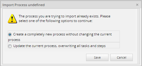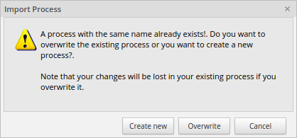 When importing a process to another installation/workspace there is the possibility that a process with the same name in its definition might already exist. When this happens, a new window will appear where the following two options need to be considered: