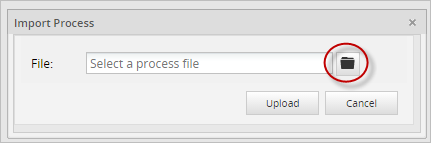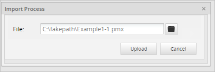 • The name file will be shown in the Import Process window, but it is not imported yet. Remember that the file being uploaded must have a .pmx or a .bpmn (for only diagrams) extension, otherwise an error message will be shown and the file won’t be uploaded. If the extension is correct then click on the Upload button to import the process.