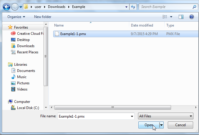• Select the .pmx file to be imported. The file can be found in the Downloads folder (unless it is configured to be stored in a different folder). Once the file is selected click on the Open button as seen in the image below.
