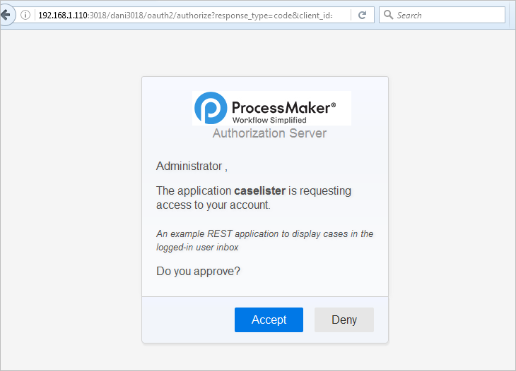 In contrast, if the grant_type is "authorization_code", authorization from OAuth2.0 is separate from login in ProcessMaker. This latter option requires the user to log into ProcessMaker (if there isn't a valid login session already open) and then click a button authorizing access by the external application. The advantage of this option is that the external application doesn't need to know the username and password of the user.