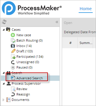 The PM_ALLCASES permission provides access to the Advanced Search option under the HOME tab. Advanced Search permits users to search for particular cases among all cases of all users in the current workspace. This feature narrows the search using the following search criteria: Category, Process, Status, User, Delegated Date, and Case Number.