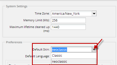 To change the default skin in ProcessMaker in the System settings, go to Admin > Settings > System > Preferences and click on the down arrow to view the list of available skins. After selecting a skin, save it by clicking on the Save settings button at the bottom of the page.