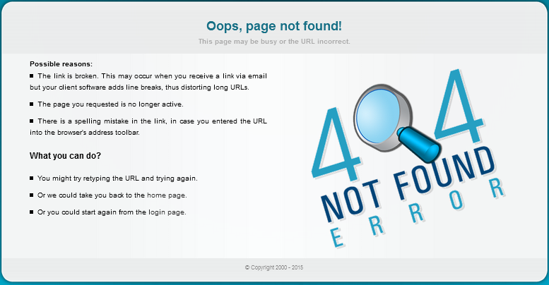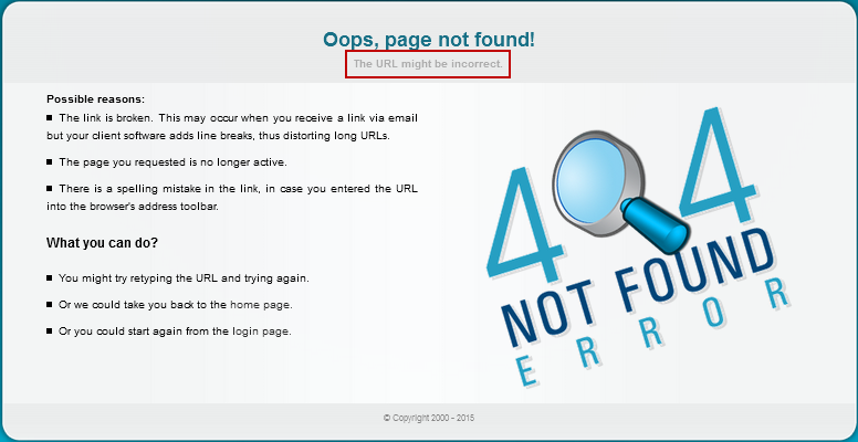 When a URL is incorrectly entered, an error page is displayed in a special skin to inform users about problems with the content or the server. A screen is shown specifying the error, along with some possible reasons for the error and some resources that might help users identify the problem.