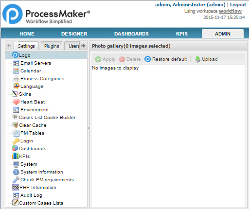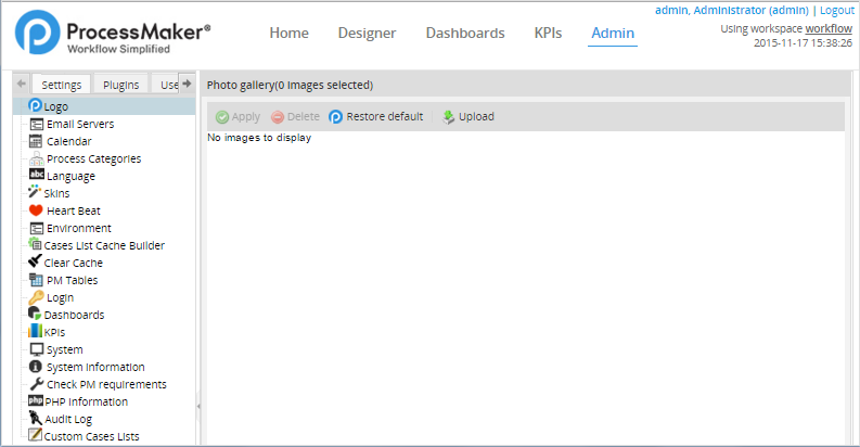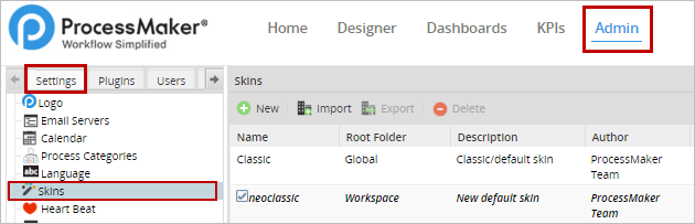 By default, the neoclassic skin is applied when ProcessMaker is installed. To change this skin, go to Admin > Settings > Skins and select a different skin from the list of all the available skins.