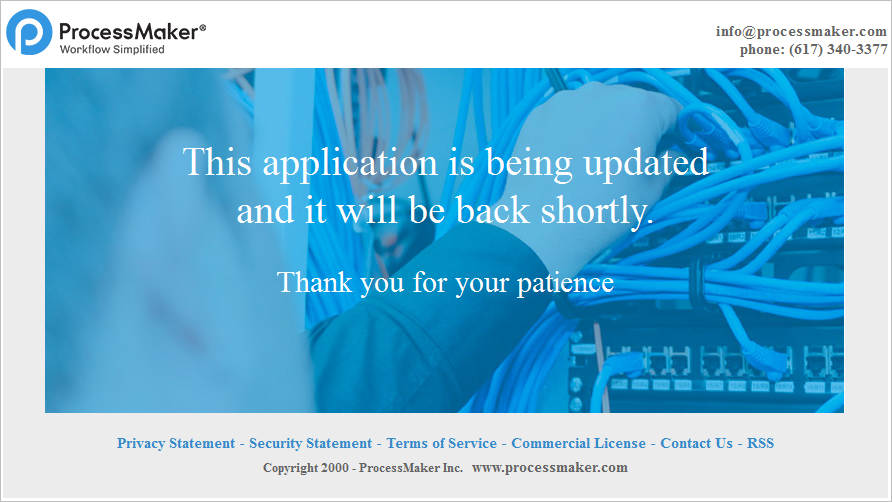 If for some reason ProcessMaker is unavailable (upgrade, server down, etc.) users will be redirected to the following page: