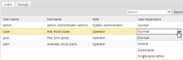 To enable this option, go to Admin > Users > User Experience, which will show the list of all the users and groups created in ProcessMaker. There are four types of User Experiences: