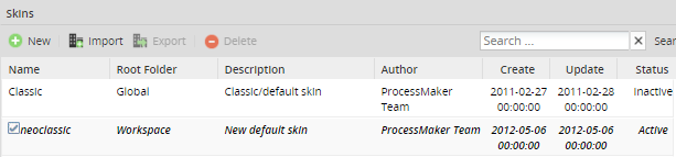 Skins provide the visual appearance of the ProcessMaker interface. By default, ProcessMaker 3.0 provides the neoclassic and classic skin for a standard blue/grey interface. New skins can be manually created to customize the appearance of ProcessMaker.