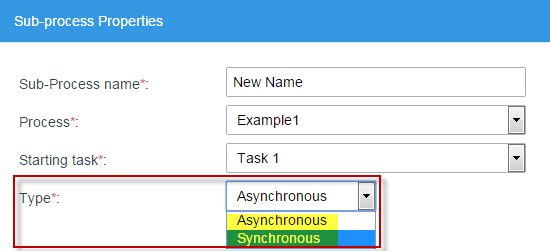 The next required field is Type, which is very important. The user selects the type of interaction between the master process and the Sub-process. As seen in the image, Type has two options, "Synchronous" and "Asynchronous". Where “Synchronous” means that the master process case will pause and wait for the Sub-processes's case to complete before continuing its execution. When a synchronous Sub-process finishes, variables can be passed from the Sub-process's case back to the master processes case. In an asynchronous process, means the master process does NOT pause and wait for the Sub-process case. Instead, the master process immediately continues with its subsequent tasks. Both the master processes case and the Sub-process's case continue executing in their own separate time, because the master process does not wait for the sub-process.