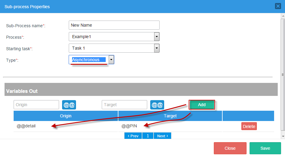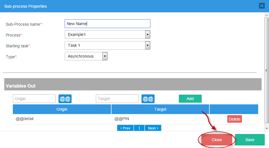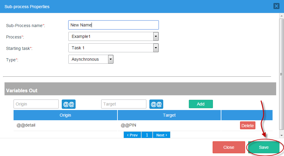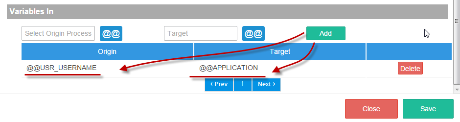 Like with Variables Out, two options are offered: “Origin” and “Target”. Choose variables for both of these options and add them to the Sub-process (as shown with Variables Out).