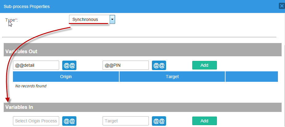 In this part, the use of Variables In options will be explained. If the process is synchronous, a new section called “Variables In” will appear (see image below). This will help select variables from the Sub-process that are passed back to the master process when the Sub-process finishes.