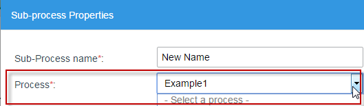 Then, the second required field is Process, where an existing process is selected to be used as the Sub-process.