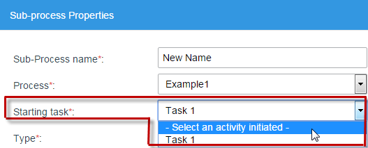 Another required field is Starting Task. This field selects the task where the case will start in the Sub-process. Only tasks that are connected to a Start Event or Start Message Event in the selected process will be displayed in the list. The Starting Task of the sub-process must have users assigned, otherwise, it won't be available to be selected.