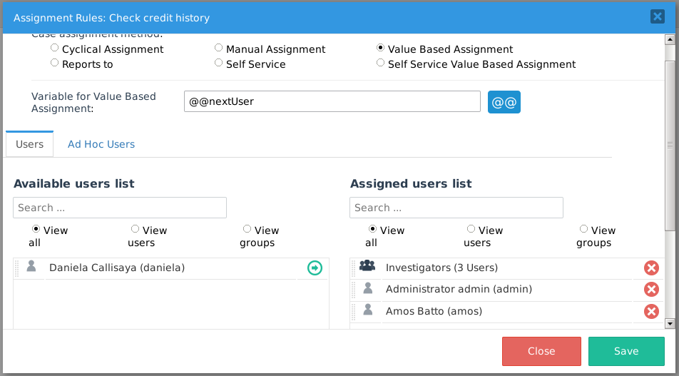 Then, go to the subprocess and in the Assignment Rules of the "Check Credit History" task, select Value Based Assignment and set its variable to be @@nextUser. Make sure that the same users who are assigned to the "Investigate Client" task in the master process are also assigned to the "Check Credit History" task. Value based assignment only works if the user ID in the variable is also in the list of users assigned to the task.