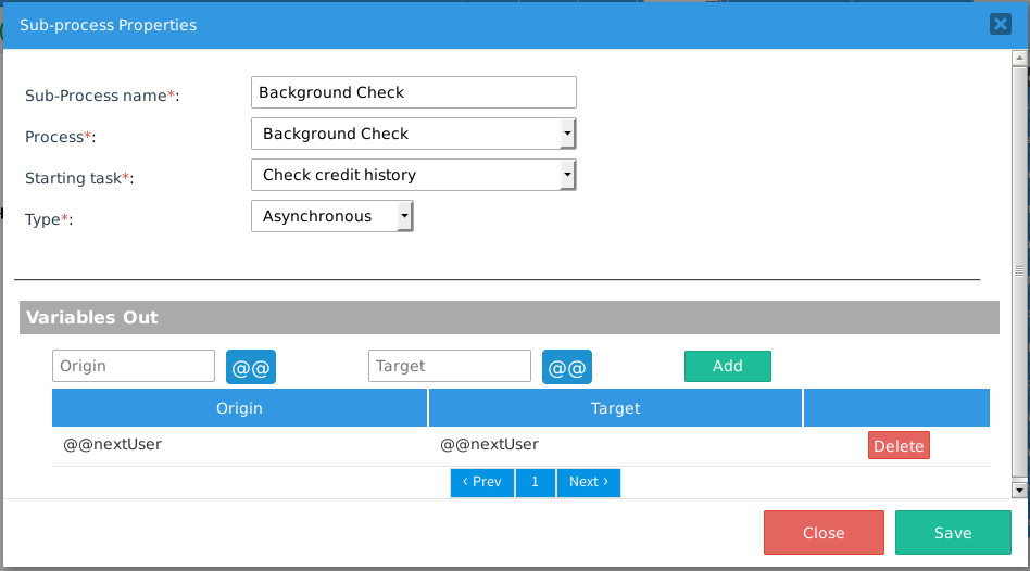 A field with the name “Origin” appears first. It introduces the names of the variables from the master process, which will be passed to the Sub-process.