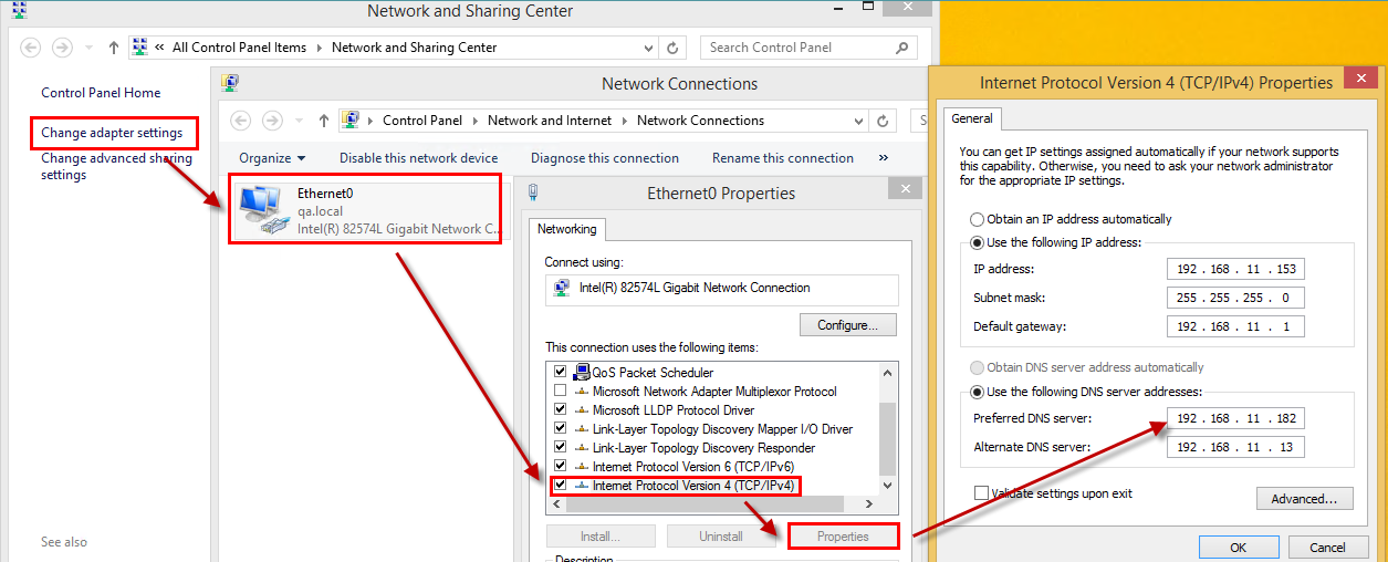 For this feature to work correctly, configure the Internet Protocol (version 4) of the user's computers to log in to Windows (and ProcessMaker) using their Active Directory credentials. To this, set the preferred DNS address to the same DNS address as the Active Directory server.