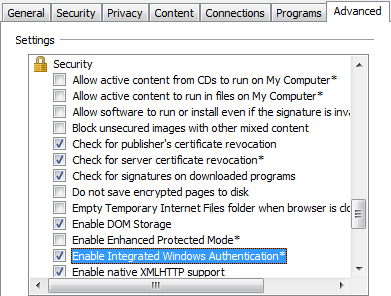 Go to Tools > Internet Options > Advanced to see if the Enable Integrated Windows Authentication option is checked.