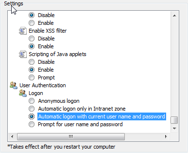 Then, go to Tools > Internet Options > Security > Custom level and check to see if the Automatic logon with current username and password option for both Internet and Local Intranet is checked.