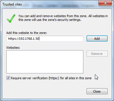 Finally, go to Tools > Internet Options > Security > Trusted sites > Sites and add the URLs where ProcessMaker is installed.
