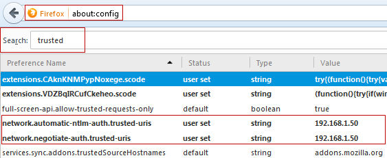 Go to the browser URL field and write "about: config", then look for the word "trusted". In the results network.automatic-ntlm-auth.trusted-uris and network.negotiate-auth.trusted-uris add the address or domain name of the server where ProcessMaker is installed.