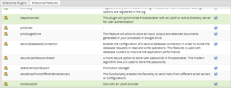 Make sure that the license installed in ProcessMaker includes the windowsSSO and ldapAdvanced features by going to Admin > Plugins > Enterprise Manager and selecting the Enterprise Features tab.