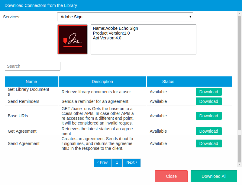 4. The Download Connectors from the Library screen displays. In the Services drop-down, select Adobe Sign.