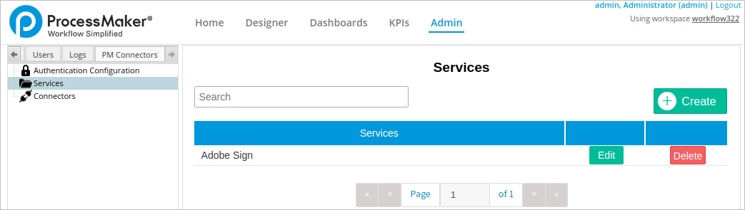 Note: After downloading all the connectors, the Adobe Sign service, and the Adobe Sign Partner Account authentication configuration automatically download. However you must use the Authentication Configuration in this page.